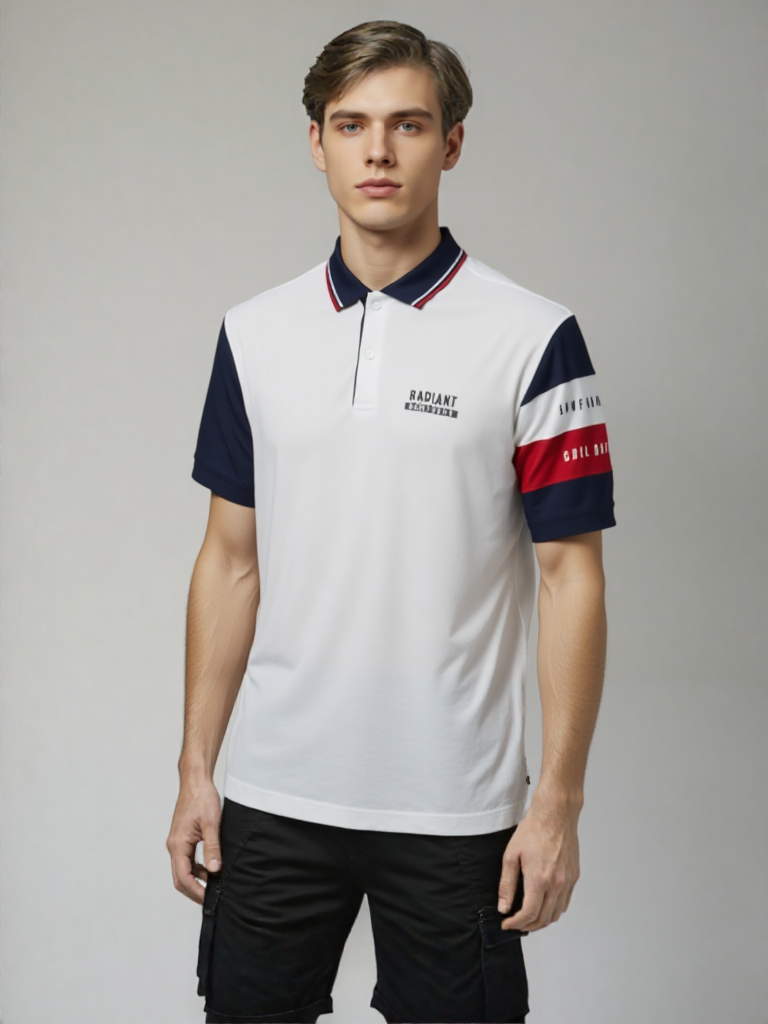 The CANTABIL Original Polo T-Shirt features a classic white base enhanced with distinctive blue and red color accents on the shoulders, adding a sharp, modern touch to its timeless style. Crafted for comfort and durability, this polo is ideal for both casual wear and smart-casual occasions, combining refined design with practical wearability.