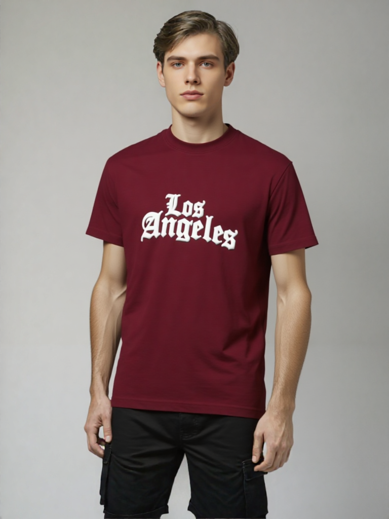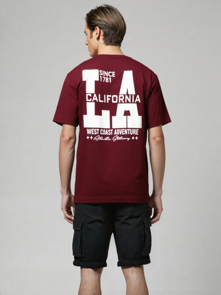 This H&M Los Angeles T-Shirt features a relaxed drop shoulder design in a rich maroon shade, accented with a bold white backprint that celebrates the iconic city. Crafted for comfort and style, it balances casual wear with graphic appeal, making it an excellent choice for fans of urban-inspired fashion.